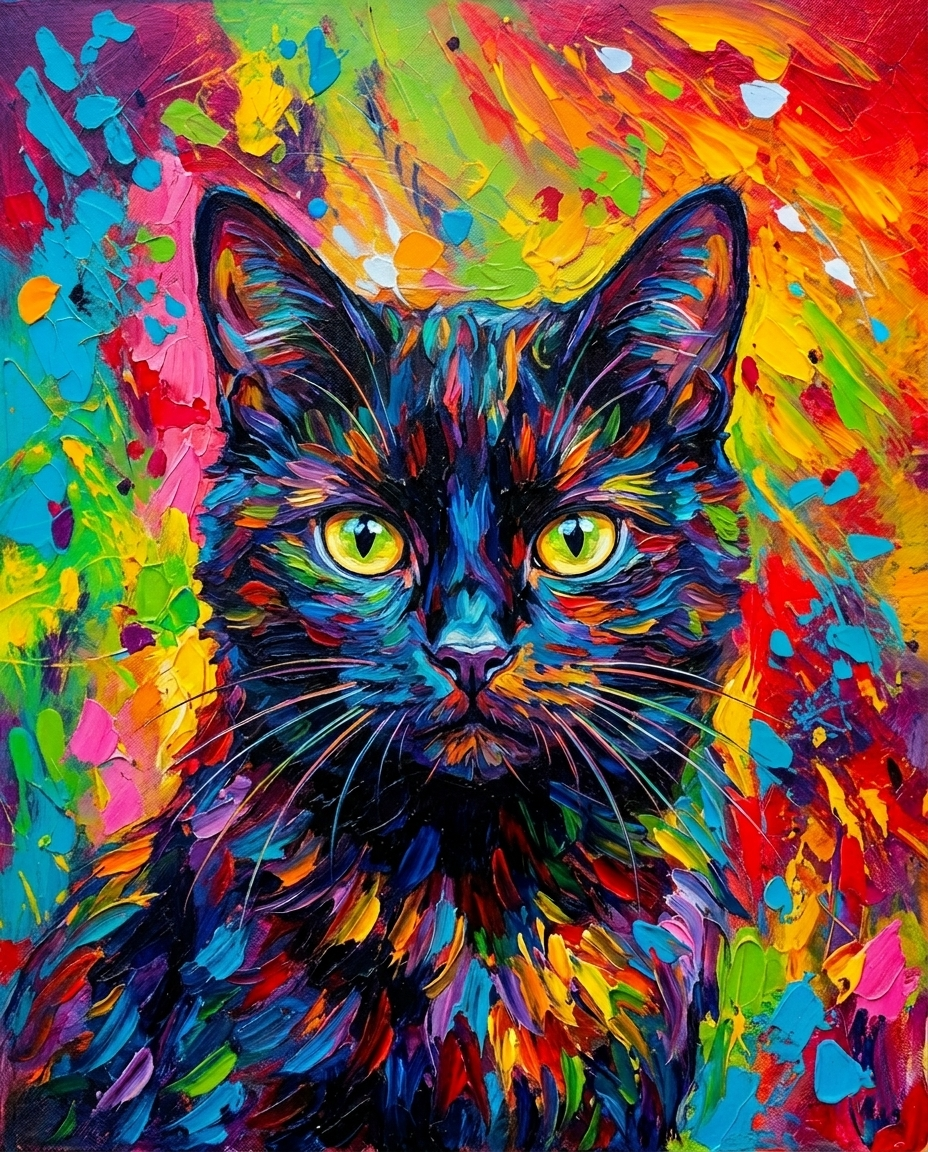 Against a rich, textured dark background, your cat’s color burst illustration stands out with a vibrant, modern presence. Every stroke is designed to build the form of their body, the character of their coat, and the mysterious expression in their eyes. It’s the perfect blend of expressionist Fine Art and classic technique, making it a spectacular statement piece for any cat-loving home.