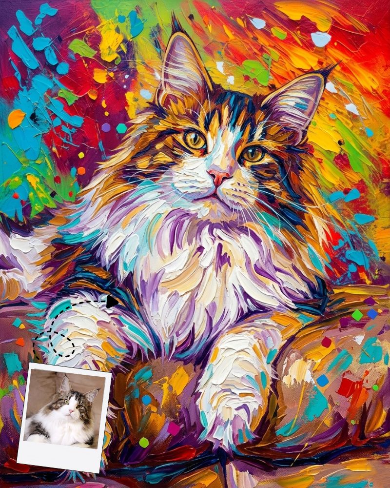 Our “The Expressionist Color Burst” Custom Cat Portrait captures the regal spirit of your feline friend in a powerful, dynamic style. Forget flat, boring portraits. This style celebrates the raw energy of palette knife painting with large, visible, dimensional brushstrokes that create a sense of movement and life.